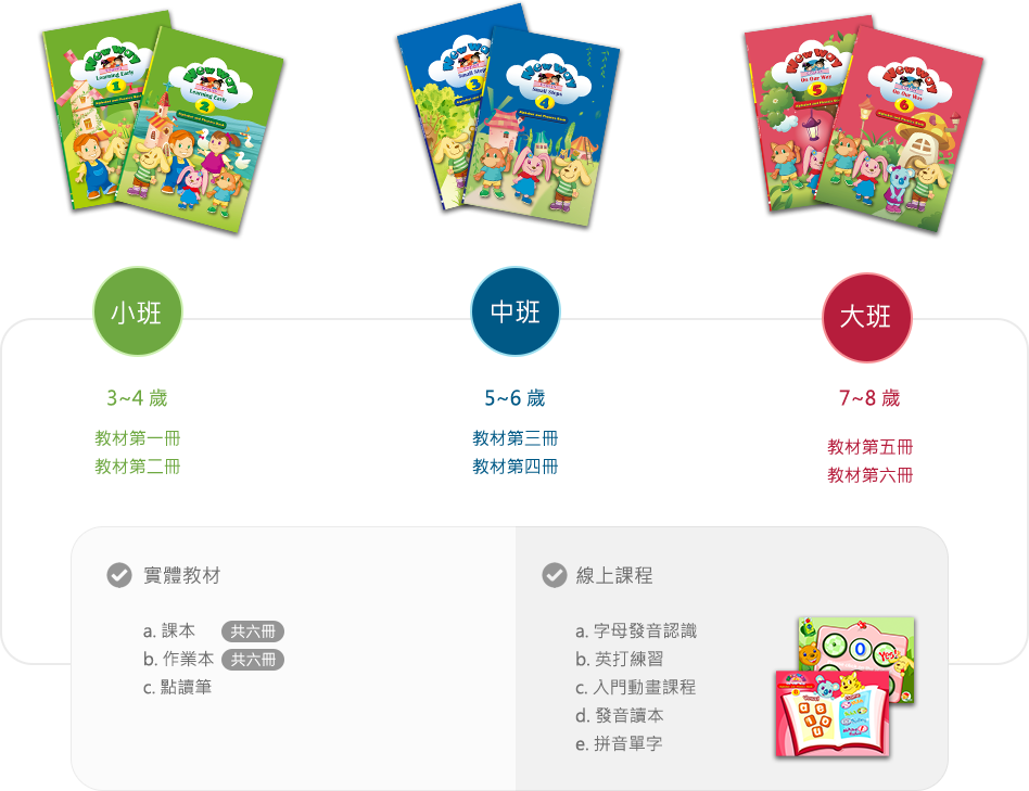 4. 進階班上學期:涵蓋長元音學習、聽音拼字、句型練習、配對互動與字母筆順學習~五本長元音發音讀本裡面除了有新的單字之外還會在複習加深之前的單字部分!